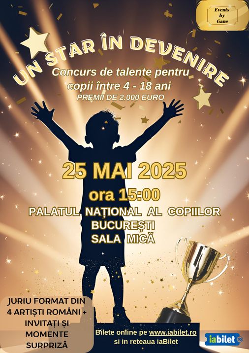 UN STAR ÎN DEVENIRE este un concurs de talente dedicat copiilor cu vârste între 4 - 18 ani și poate reprezenta o oportunitate extraordinară pentru aceștia de a-și exprima creativitatea și de a-și demonstra abilitățile în diverse domenii artistice, precum muzică, dans, film, artă plastică sau sport.